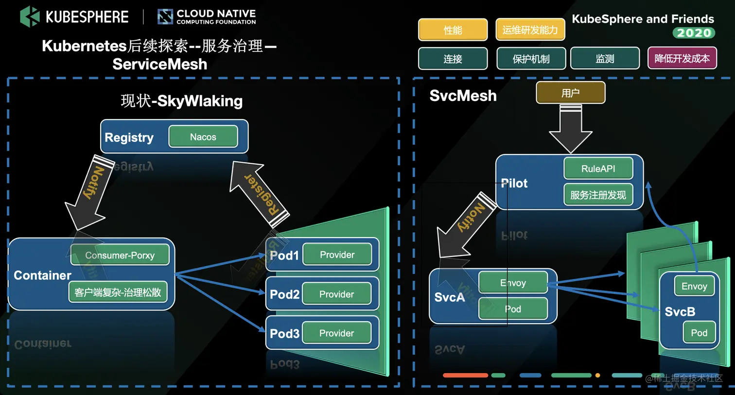 目前来说我们对于微服务治理都是基于辅助的手段,比如全链路监控,日志的指标,来做微服务的流量控制和垄断。后续我们想往服务网格上探索,把流量的监测和控制放在平台层,开发只需要专注于业务的逻辑,目前还没有比较好的落地方案。