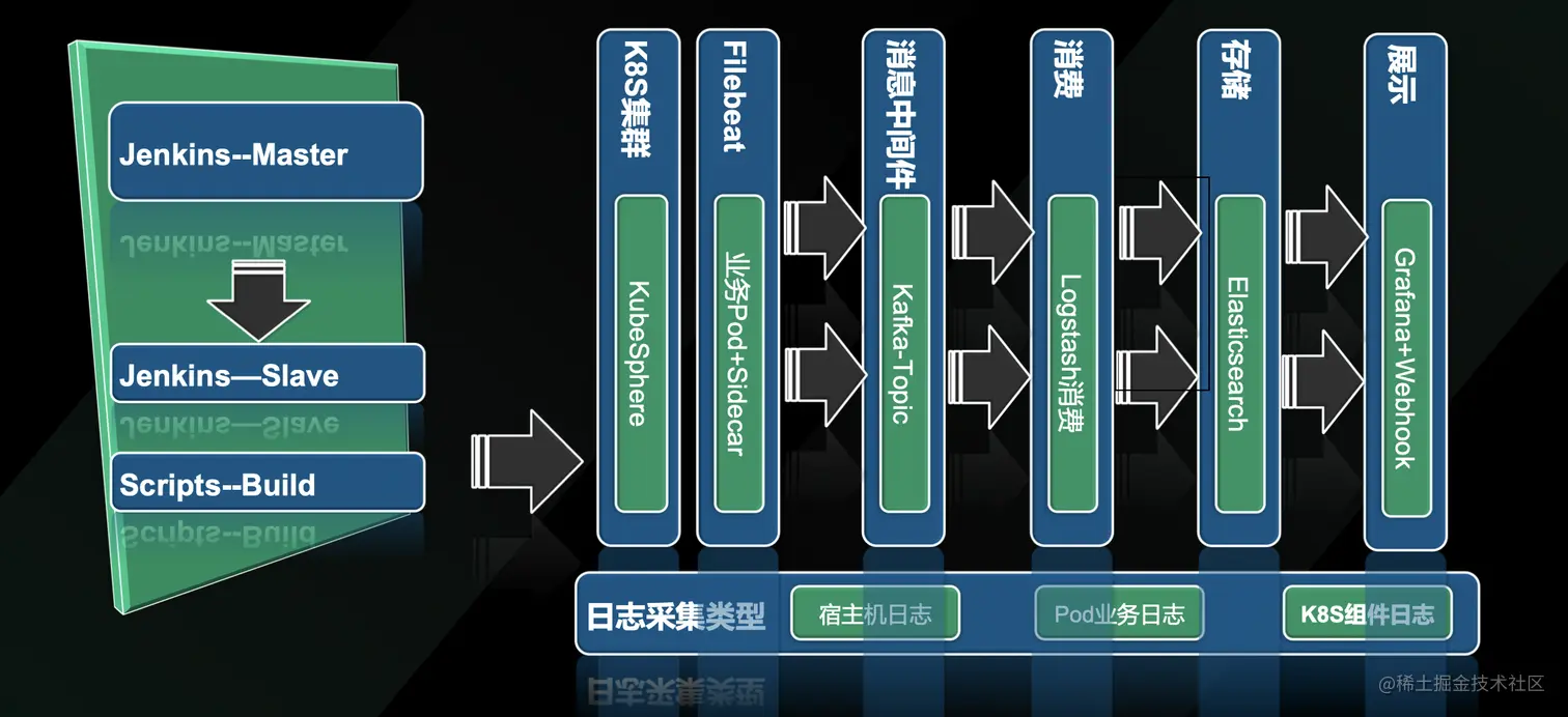 日志采集相对来说会麻烦一点,目前对接的 ELK 的工具链,底层主要是采集三种类型的日志,宿主机日志、Pod 业务日志和 Kubernetes 组件相关的日志。宿主机和 Kubernetes 组件日志都是基于宿主机采集。