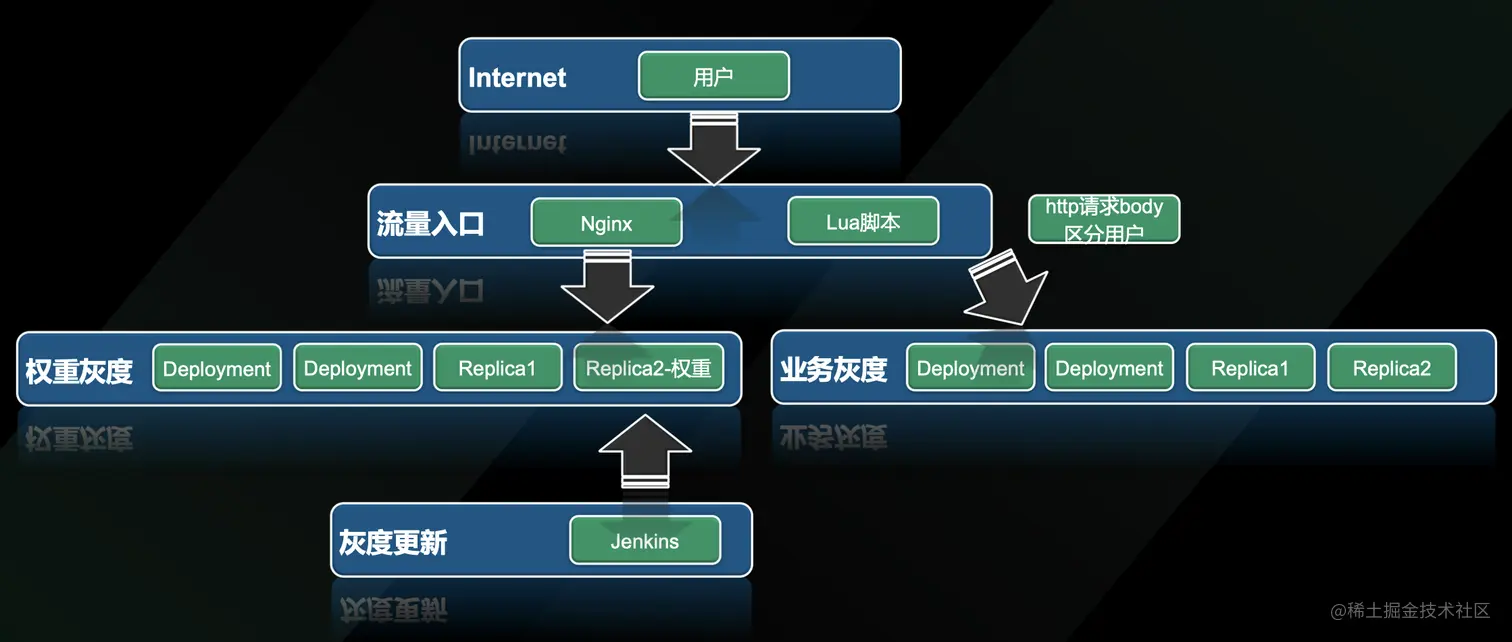 针对大版本迭代 使用业务灰度方式。针对用户的 HTTP 请求的头部以及 body 里用户的 ID,通过 Nginx 和 lua 脚本,分发到不同的版本上面去。