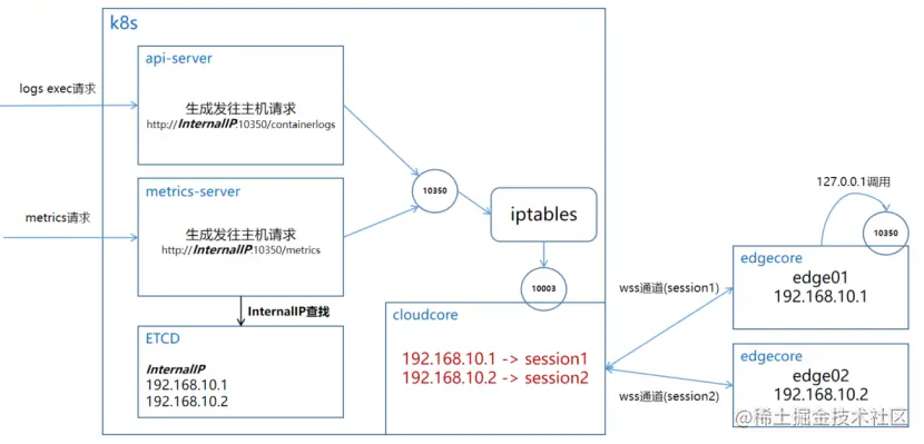 在上一篇文章中,其实也简要介绍了 metrics 数据获取在 KubeEdge 边缘场景下的实现原理:kube-apiserver 上的 iptables 转发给云端的 Cloudcore,Cloudcore 通过和 Edgecore 之间的 WebSocket 通道向边缘端进行消息和数据传递。