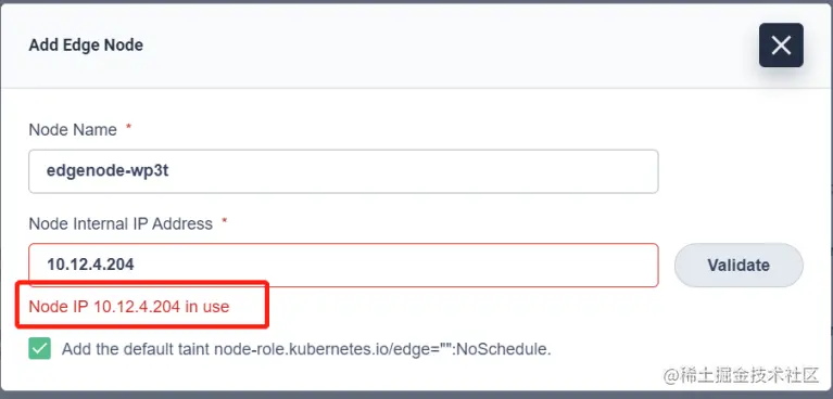 在上一节中展示了内网 IP 被占用的结果就是不能加入集群,因为该 IP 已经被注册在了 EdgeWatcher 中,不能再被其他边缘节点使用。