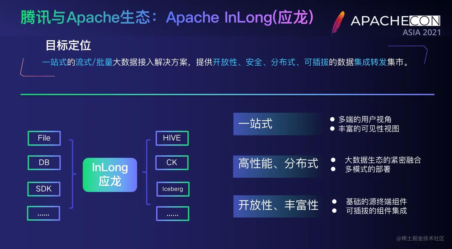 2019年,腾讯将自研的万亿级大数据组件 —— TubeMQ 项目捐赠给了Apache基金会,这也是腾讯第一个捐赠到Apache基金会的开源项目,今年其正式更名为Apache InLong,目前正在Apache基金会进行孵化。