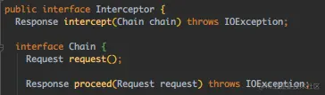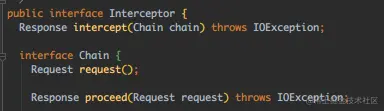 通过继承 Interceptor 接口,重写intercept(Chain)函数来实现一个自定义拦截器,看下接口: