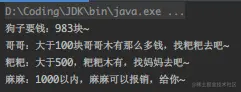 System.out.println("哥哥:大于100块哥哥木有那么多钱,找粑粑去吧~");