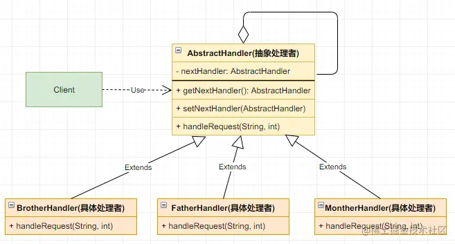 - Handler (抽象处理者) → 定义了处理请求的接口或抽象类,提供处理请求的方法和设置下一个处理者的方法;