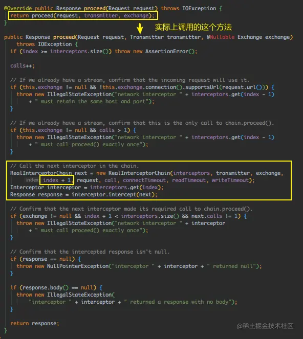 chain.proceed()返回Response实例为止,而这个实例会往前传递,前面调用了chain.proceed()的拦截器可以获得Response实例并进行加工(如打日志),第一个调用了chain.proceed()的拦截器得到的就是处理完后的Response。