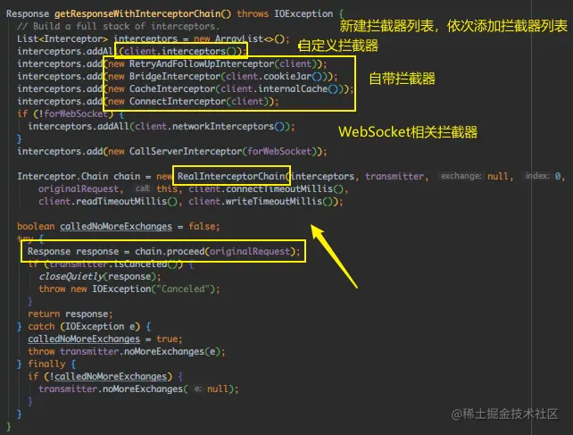 把拦截器全加到列表里,等下按顺序走,很好理解,然后是这个 RealInterceptorChain,关注下传入参数,除了关注interceptors列表外,还要关注一个 index,传入的值为0。