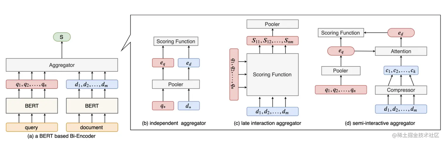 一个基本的稠密检索方法会将文档和查询编码成为一个向量。然而由于文档包含的信息较多,容易造成信息丢失。为了改进这一点,有些工作开始对查询和文档的向量表示进行改进,目前已有的改进方法大致可分为三种,如下图所示: