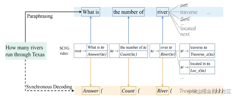 语义同步解码的核心思想是将语义解析转换为复述问题。我们将句子复述成标准句式,同时解析出语义表示。其中,标准句式和逻辑表达式存在一一对应关系。为了保证生成有效的标准句式和语义表示,标准句式和语义表示在同步文法的限制中解码生成。