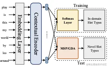 - 测试阶段:首先使用训练的序列标注模型进行域内实体类型的预测,同时基于得到的实体表征,使用MSP或者GDA算法预测一个词是否属于Novel Slot,也即域外类型,最后将两种输出结果进行合并得到最终的输出。