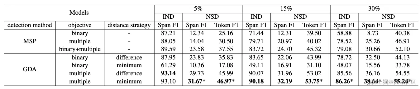 我们使用实体识别的F1作为评价指标,包括Span-F1和Token-F1,二者的区别在于是否考虑实体边界,实验结果如下: