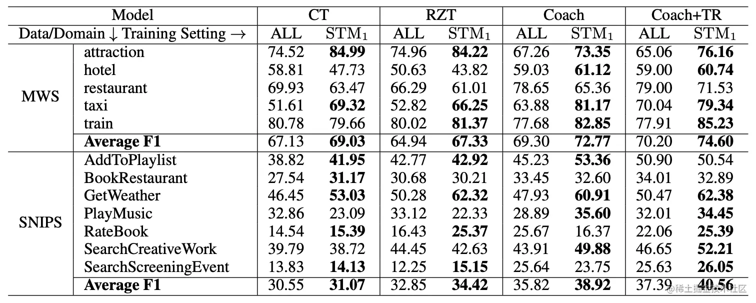 我们并没有提出新的模型,但是我们提出的源槽选择方法可以与所有的已知模型进行结合,在多个已有模型及数据集上的实验表明,我们提出的方法能为目标任务槽填充模型带来一致性的性能提升(ALL所在列表示已有模型原始的性能,STM1所在列表示用我们的方法选出的数据训练的模型性能。)