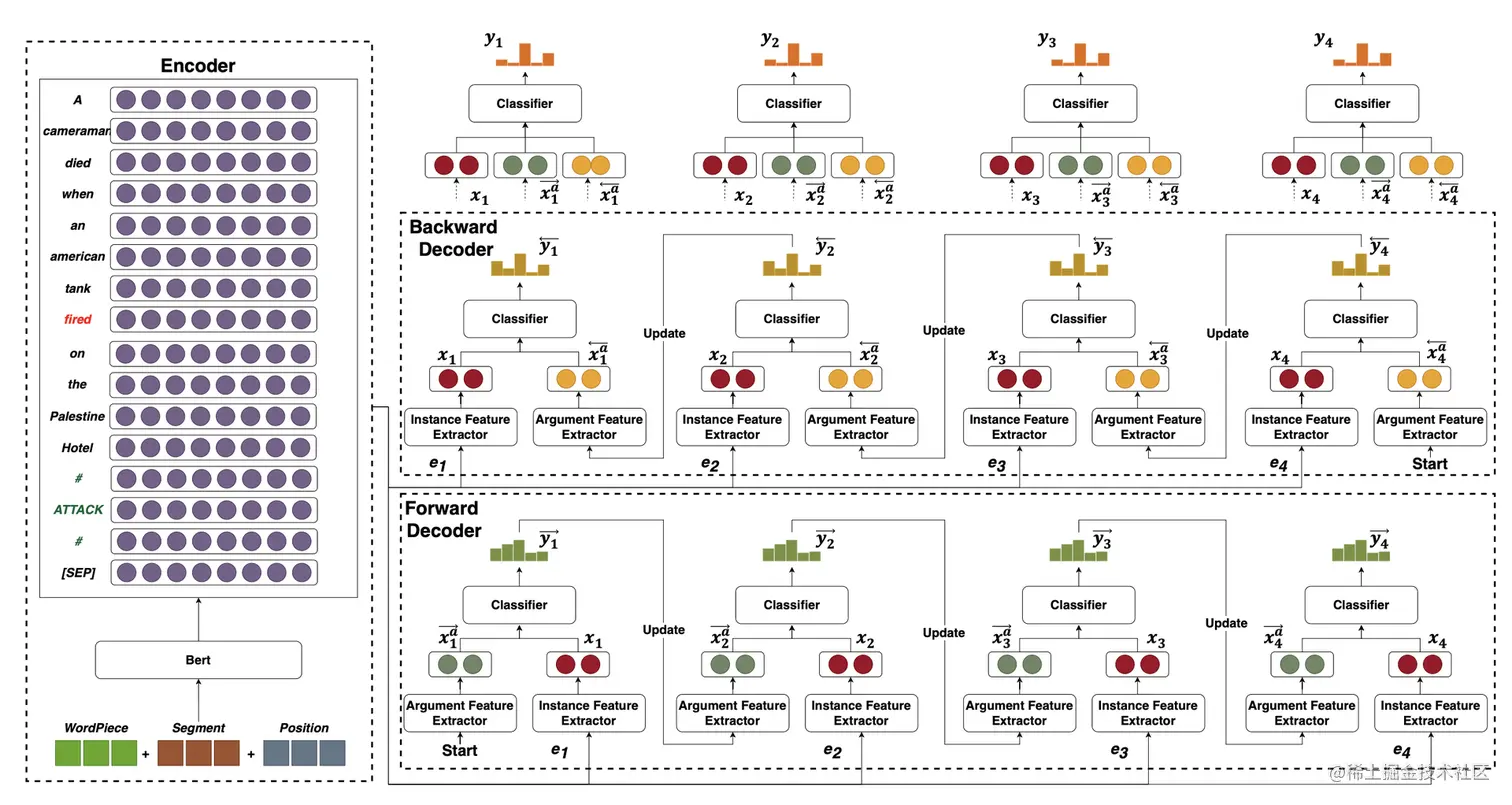 针对目前事件论元检测中存在的问题,本文提出显示地利用周边实体的语义级别的论元角色信息。为此,本文首先将论元检测建模为实体级别的解码问题,给定句子和已知事件,论元检测模型需要生成论元角色序列;同时与传统的词级别的Seq2Seq模型不同,本文提出了一个双向实体级解码器(BERD)来逐步对每个实体生成论元角色序列。具体来说,本文设计了实体级别的解码循环单元,能够同时利用当前实例信息和周边论元信息;并同时采用了前向和后向解码器,能够分别从左往右和从右往左地对当前实体进行预测,并在单向解码过程中利用到左侧/右侧的论元信息;最终,本文在两个方向解码完成之后,采用了一个分类器结合双向编码器的特征来进行最终预测,从而能够同时利用左右两侧的论元信息。