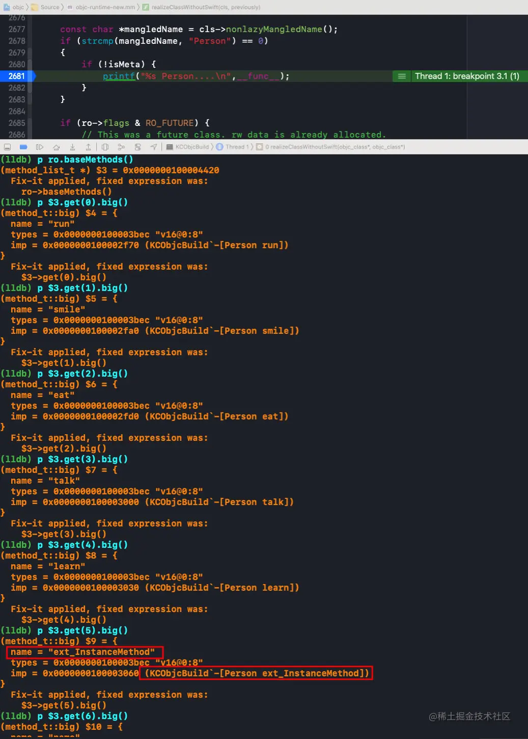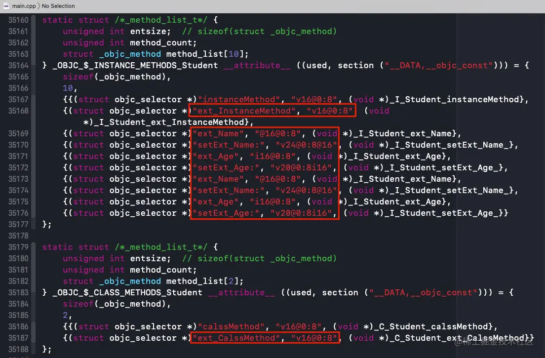 可以看到,我们在扩展中定义的方法和属性和在类中声明的方法和属性是一样存储的;