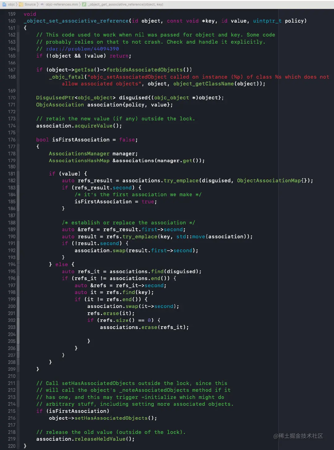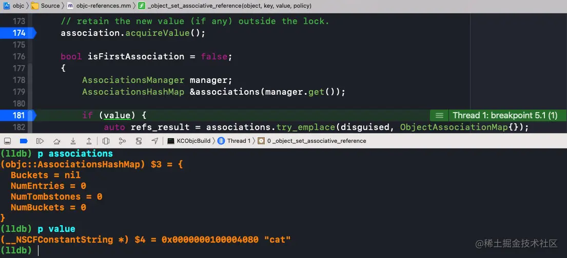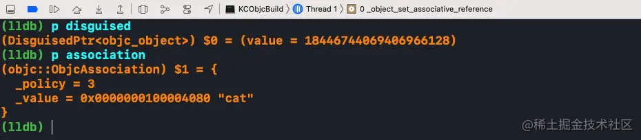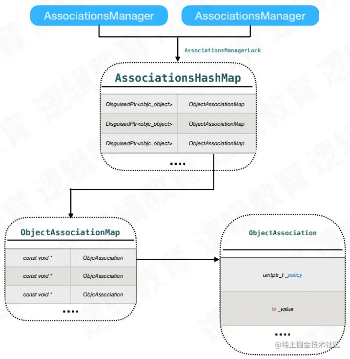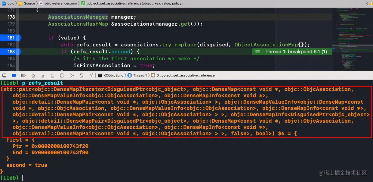 object:对象,也就是被关联着key:标识符value:值policy:关联策略;DisguisedPtr<objc_object> disguised{(objc_object *)object}:将被关联对象进行包装,封装成ptr,统一数据结构;ObjcAssociation association{policy, value}:将policy和value包装成ObjcAssociation,然后与key进行键值匹配;association.acquireValue():根据policy对新值value进行操作持有AssociationsManager manager:是一个构造函数,在作用域开始进行加锁和结束进行解锁,需要注意的是它并不是单例AssociationsHashMap &associations(manager.get()):是个单例,是一张全局唯一的表;associations.try_emplace(disguised, ObjectAssociationMap{}):创建插入bucketresult.second判断是否是第一次插入,如果已经存在bucket,second为false,否则为true,并用isFirstAssociation进行标记;refs.try_emplace(key, std::move(association)):由于第一次没有找到bucket时,插入的是个空的bucket,所以需要再次try_emplace将key和association传入,把关联对象存储到表中