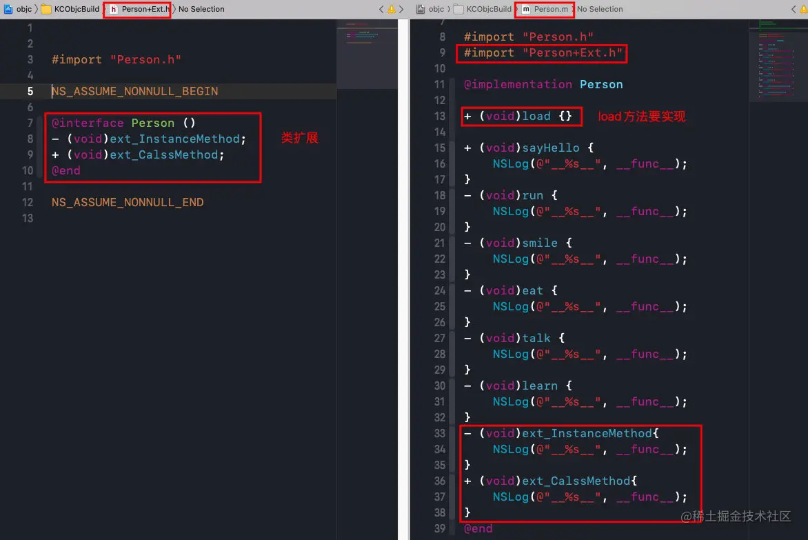 我们新建一个类Person的类扩展文件,并声明对象方法和类方法,然后在Person的.m文件中实现两个方法: