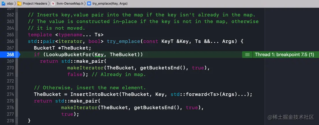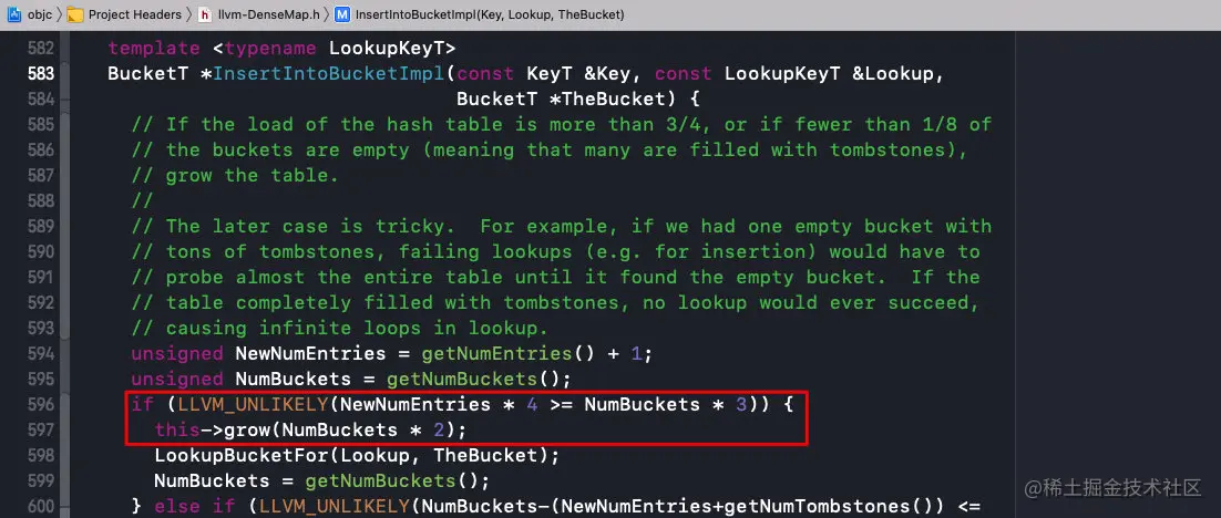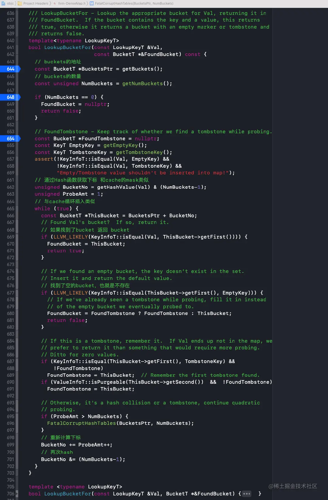 const BucketT *BucketsPtr = getBuckets();:获取buckets的地址const unsigned NumBuckets = getNumBuckets();:获取buckets的数量- 如果找到了