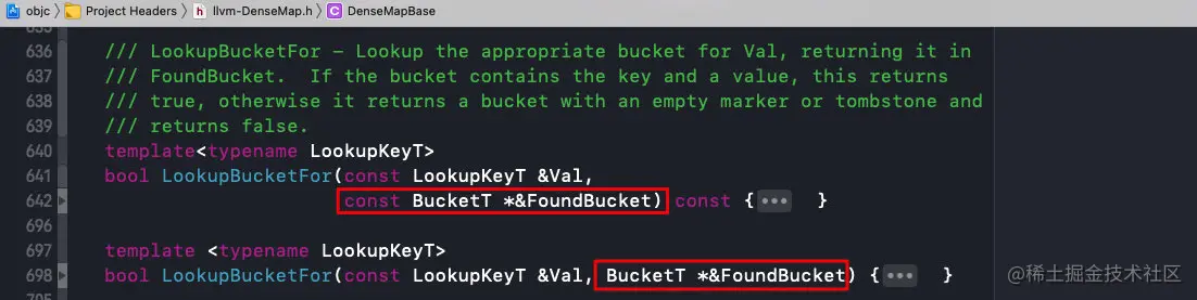 这里有两个LookupBucketFor,两个方法的参数不一样,一个带const,一个没有;两个方法通过指针传递的方式在内部进行调用;将FoundBucket回传,内部的修改了,外部的FoundBucket也会同步变化;
