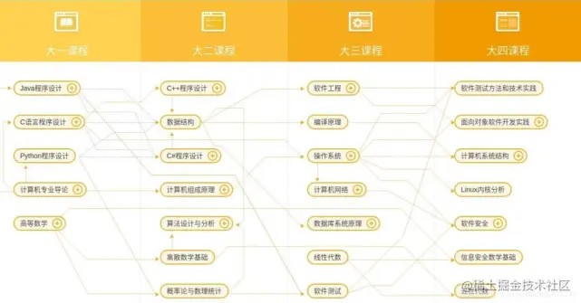 以上其实是大厂面试官的考核范围,并且他们之间有前置知识点的相关性,简单点说:不会基础语言不会算法和数据结构,你肯定没法刷题,也没法看懂计算机网络和操作系统、组成原理等等。