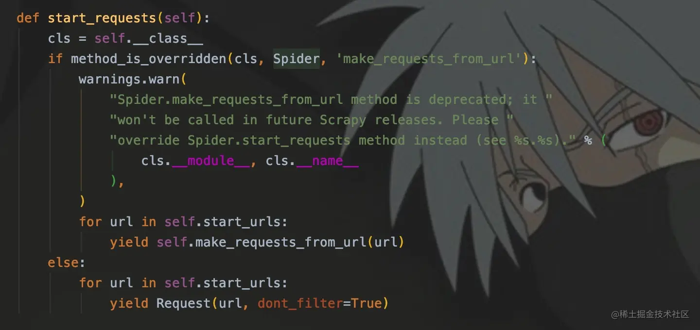 每个爬虫程序都继承了Spider类,里面的start_requests方法用来发起请求,并自动将响应传递给parse()。