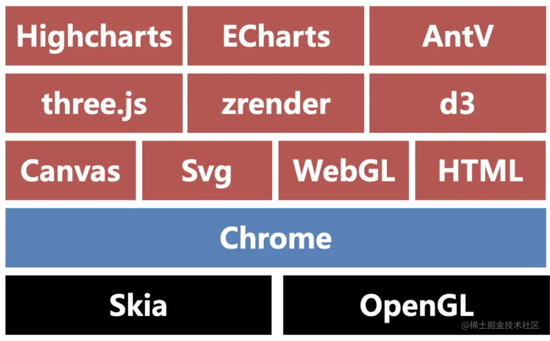 其中Chrome使用Skia作为绘图引擎,向上层开发了canvas、svg、WebGL、HTML绘图能力。