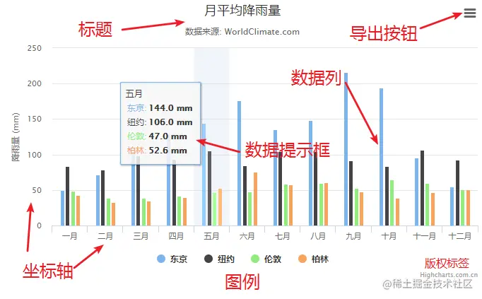 Highcharts 包含标题(Title)、坐标轴(Axis)、数据列(Series)、数据提示框(Tooltip)、图例(Legend)、版权标签(Credits)等,另外还可以包括导出功能按钮(Exporting)、标示线(PlotLines)、标示区域(PlotBands)、数据标签(dataLabels)等。