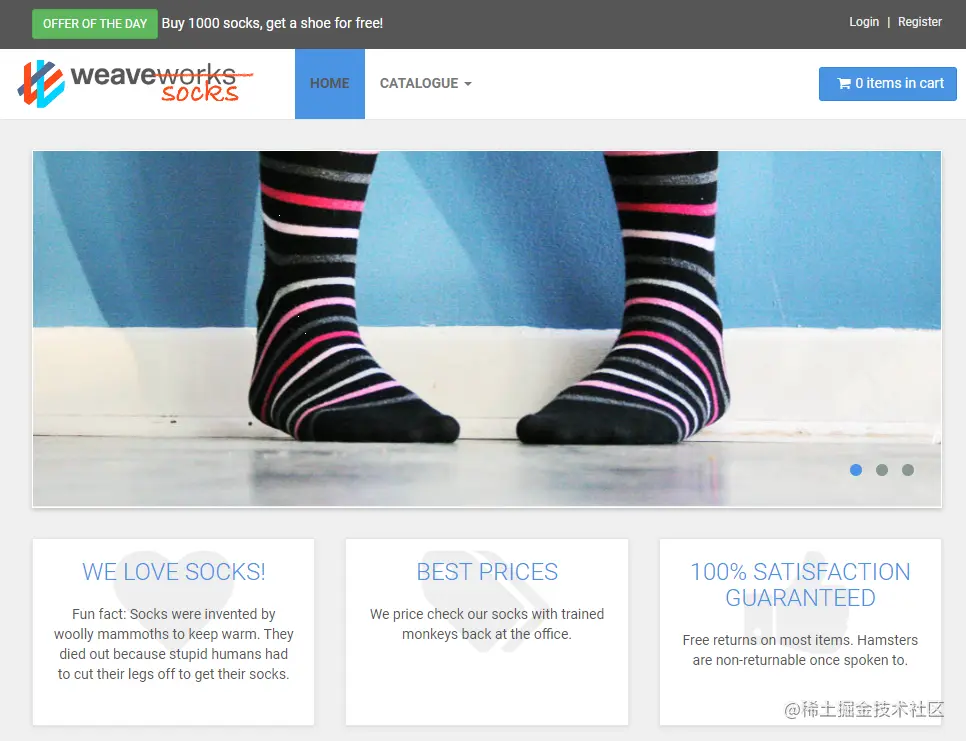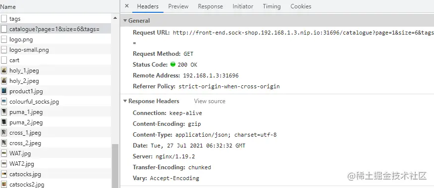 - 我们再次访问 SockShop 的网站页面,该页面并没有任何变化。我们使用浏览器调试器,再次查看网络请求,