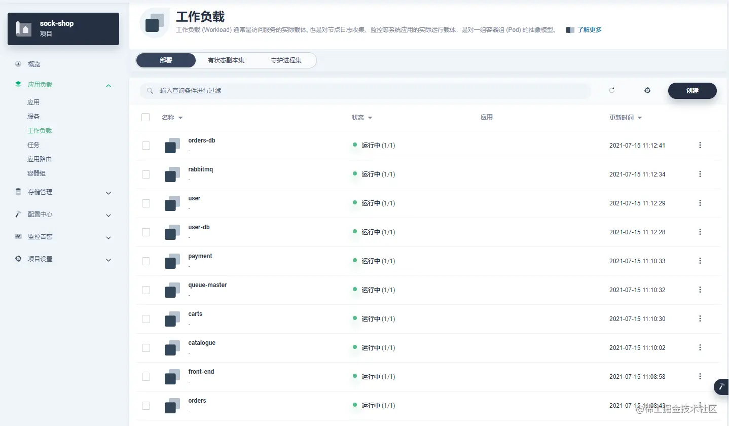 执行过后可以进入 sock-shop 的工作负载页面查看部署的状态,等待所有的部署都正常运行后,我们再进行下一步操作。