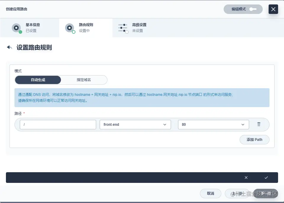 frontend。在路由规则中,添加一条新的规则。由于是演示项目,我们使用自动生成模式。KubeSphere 自动以<服务名称>.<项目名称>.<网关地址>.nip.io 格式生成域名,该域名由 nip.io 自动解析为网关地址。在路径、服务、端口上依次选择 "/"、"front-end"、"80"。点击下一步后,继续点击创建。