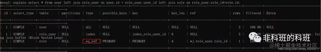eq_ref表示使用唯一索引或者主键索引扫描作为表链接匹配条件,对于每一个索引键,表中只有一条记录与之匹配。例如:explain select * from user left join role_user on user.id = role_user.user_id left join role on role_user.role_id=role.id;