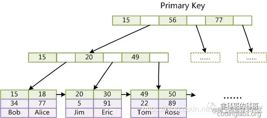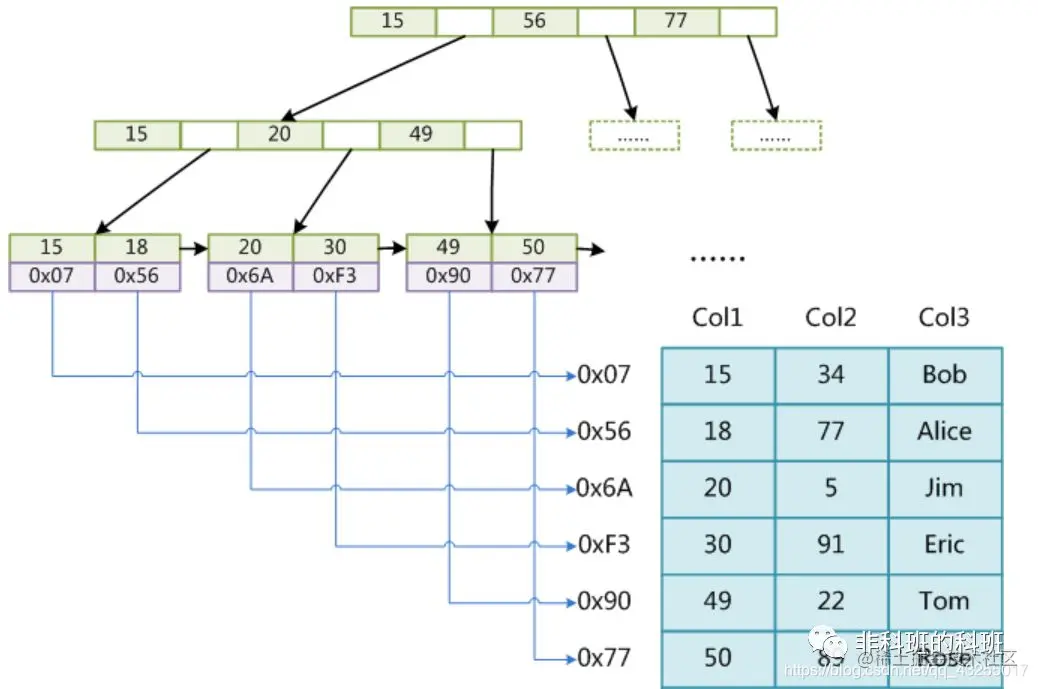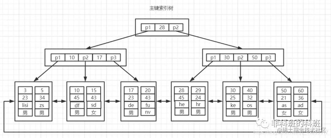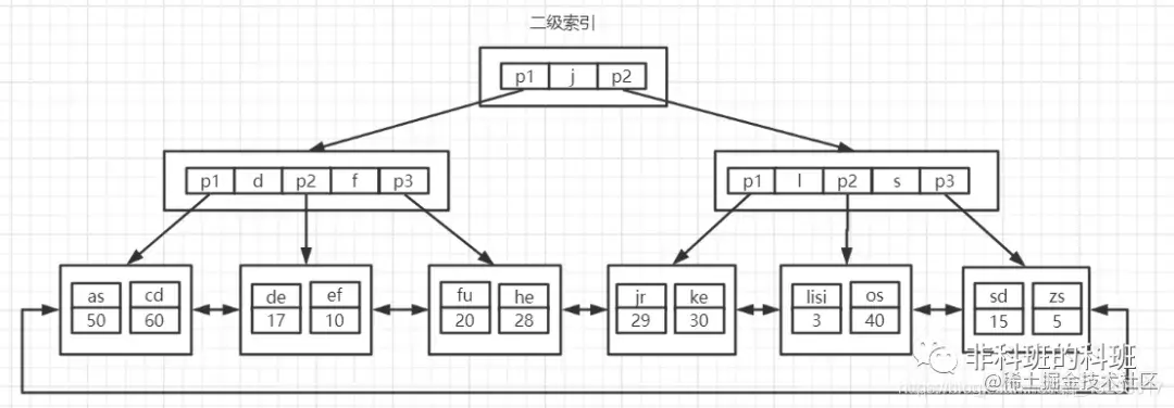 所以总结来说:B+树是多叉树,一个数据页的大小是16kb,在1-3的树高就能存储10亿级以上的数据,也就是只要访问磁盘1-3次就足够了,并且B+树的叶子结点上一个叶子结点有指针指向下一个叶子结点,便于范围查询: