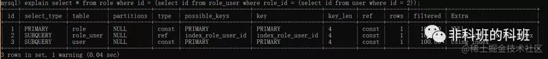 | 2 | SUBQUERY | user | NULL | index | NULL | PRIMARY | 4 | NULL | 3 | 100.00 | Using index |