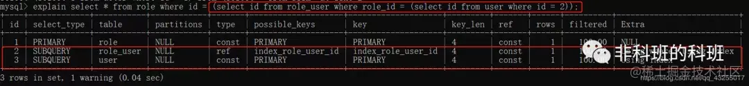PRIMARY 复杂查询中「最外层的select语句的查询类型就是PRIMARY」,例如执行下面的sql:explain select * from role where id = (select id from role_user where role_id = (select id from user where id = 2));
