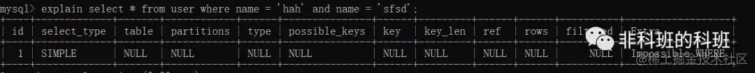 Impossible where会出现在where后的条件一直为false的情况下,这种可以忽视,比较少出现:explain select * from user where name = 'hah' and name = 'sfsd';