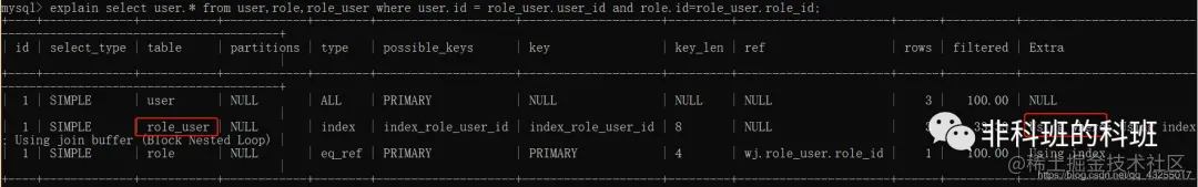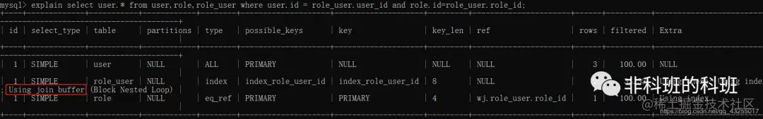 Using join buffer表示使用连接缓存:explain select user.* from user,role,role_user where user.id = role_user.user_id and role.id=role_user.role_id;