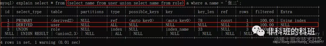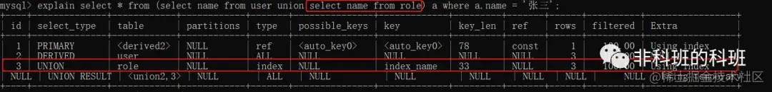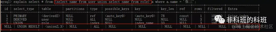 UNION RESULT 「UNION查询语句的结果被标记为UNION RESULT」,如上面执行的sql:explain select * from (select name from user union select name from role) a where a.name = '张三';
