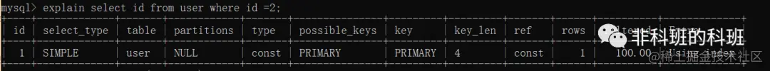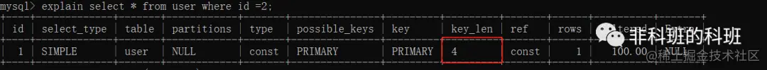 一般来说在不损失精度的前提下,key_len是越小越好,比如上面的测试表的id为int类型,int类型由4个字节组成:explain select * from user where id =2;