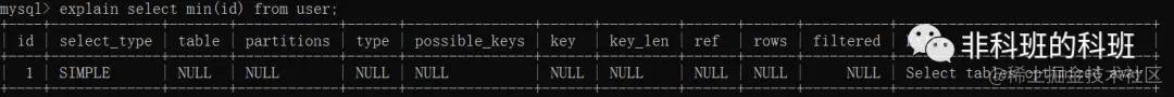 表示select语句没有遍历表或者索引就返回数据了,比如:explain select min(id) from user;