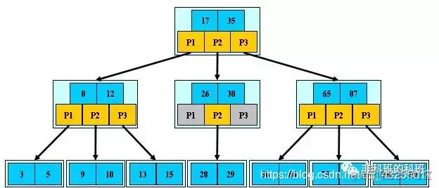 B树基于减少树的高度上,B树是一种多路搜索树,每个节点都可以有多于两个子节点,并不是二叉的:
