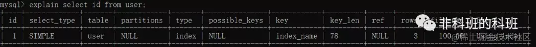 表示查询的列被索引覆盖,这个是查询性能比较高的体现,即所要查询的信息搜在索引里面可以得到,不用回表,索引被正确的使用:explain select id from user where id =2;