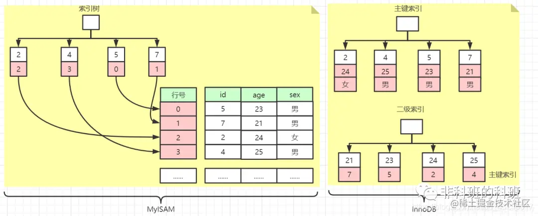 MyISAM的索引方式也叫做“非聚集”的,之所以这么称呼是为了与InnoDB的聚集索引区分。