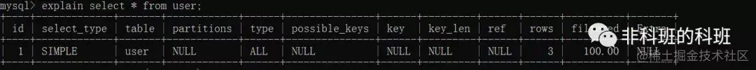 | 1 | SIMPLE | user | NULL | ALL | PRIMARY | NULL | NULL | NULL | 3 | 100.00 | NULL |