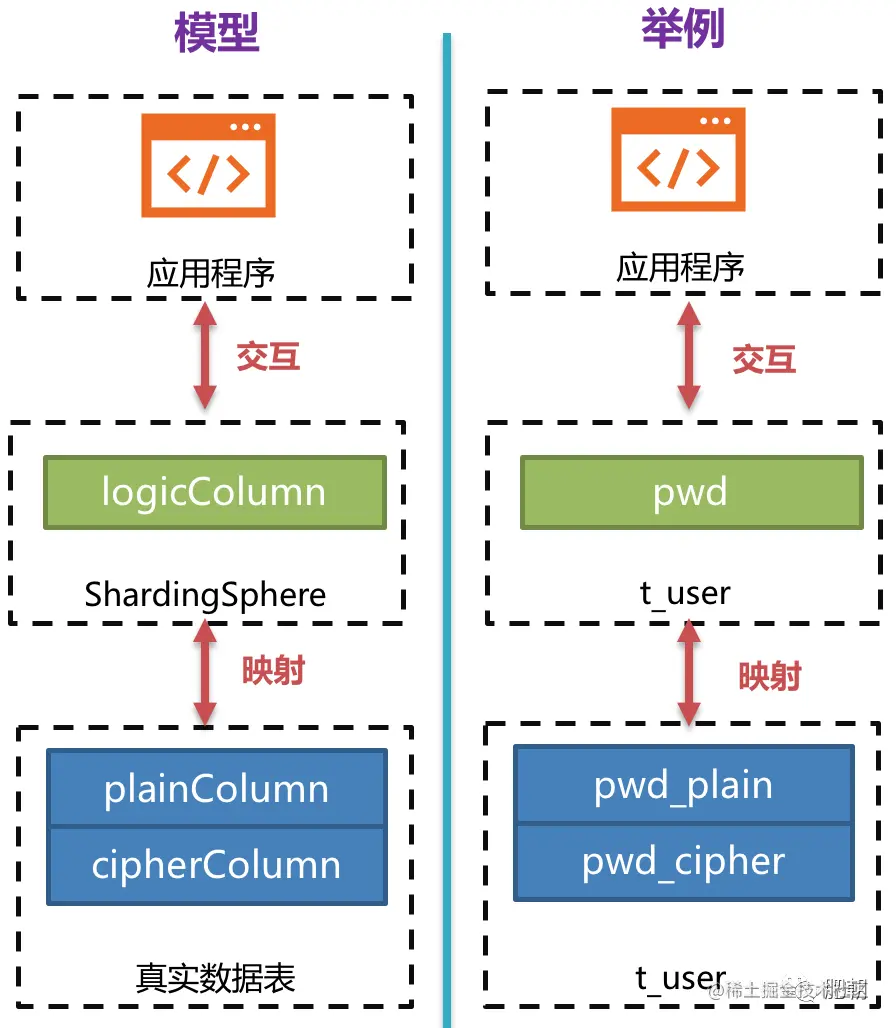 - 创建EncryptTableRuleConfiguration 的时候需要传入一个map,这个map存的value即#1中说明的EncryptColumnRuleConfiguration ,而其key则是一个逻辑列,对于新系统,此逻辑列即为真实的脱敏列。Sharding Shpere在拦截到SQL改写的时候,会按照用户的配置,把逻辑列映射为名文列或者脱敏列(默认)如下的示例