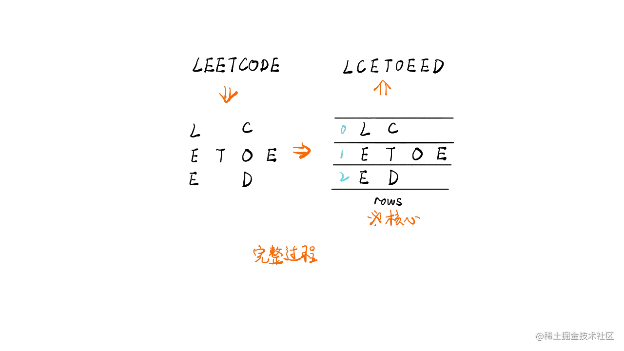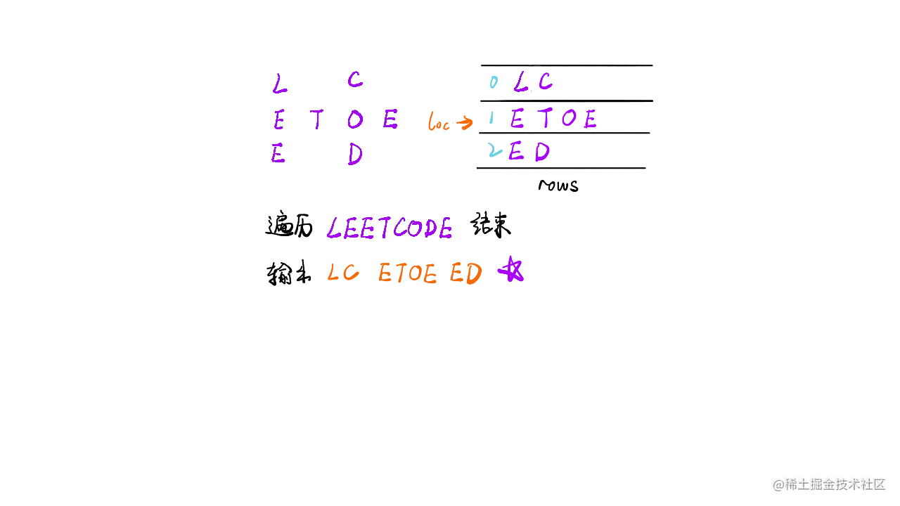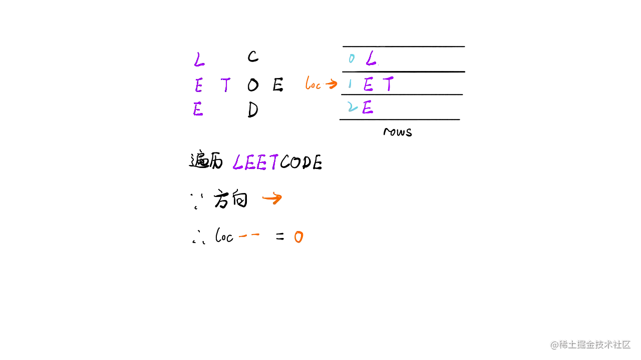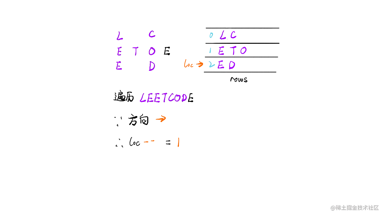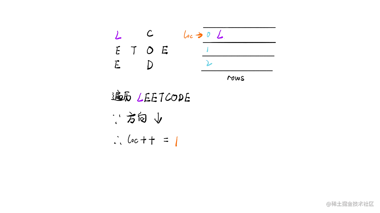 - 否则整个字符串需要经历,向下向右,向下向右,这样的反复循环过程,设定 downdowndown 变量表示是否向下,loclocloc 变量表示当前字符串数组的下标