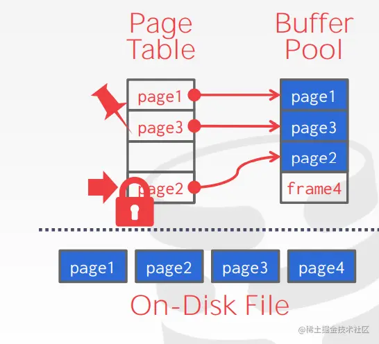 - 这里页表是用来记录page id到内存中(buffer pool)中的对应page 位置的映射的。