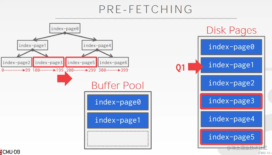 - 例如,query plan发现需要读page0 - page4,那么首先page0读入内存,在处理page0中的数据的时候,就可以预先把剩余的部分也读入内存,这样当处理完page0之后,想访问page1中的数据就不用等着它载入内存了。