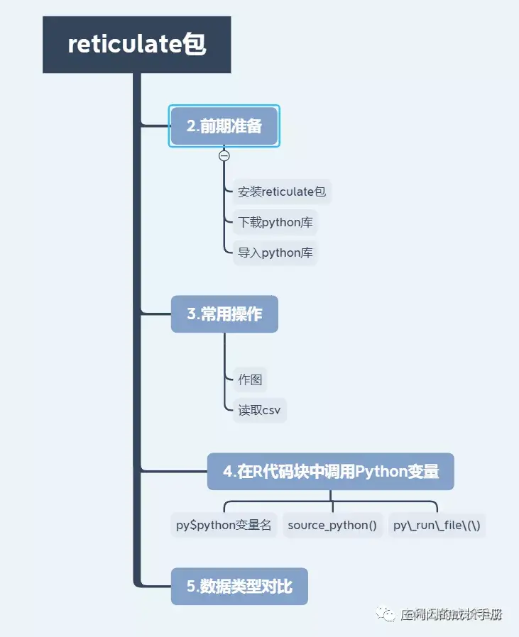 1)在 R 中支持多种方式调用 Python。包括 R Markdown、加载 Python 脚本、导入 Python 模块以及在 R 会话中交互式地使用 Python。