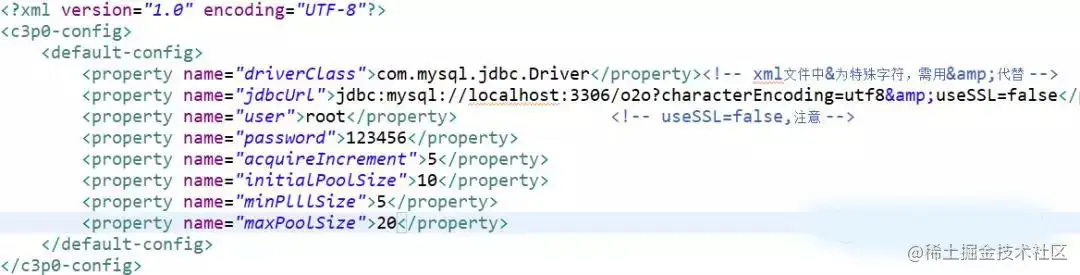 注意此处的jdbcurl的地址,我就在此处报错的,xml中&为特殊符,需要用&;代替,另外useSSL要置为false,否则会出现sql报错,(我的是这样,不知道别人的是不是),那么问题来了,该如何获取该配置文件的信息呢?此时我们建立一个C3p0的单元类来获取,