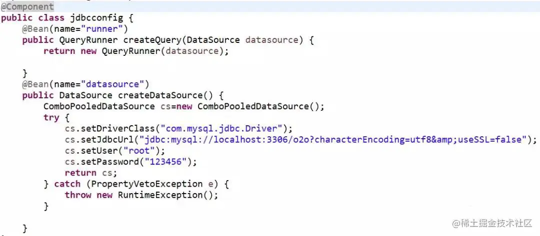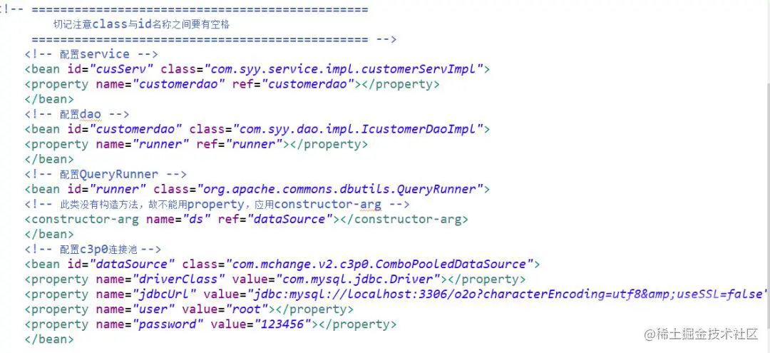 注意此处的runner的id,由于QueryRunner没有set方法,故不能使用property来进行配置,只能使用构造函数方法来使用;除了解耦和测试调用配置,其他都一样。