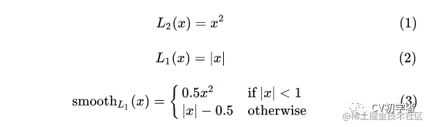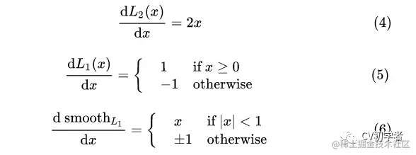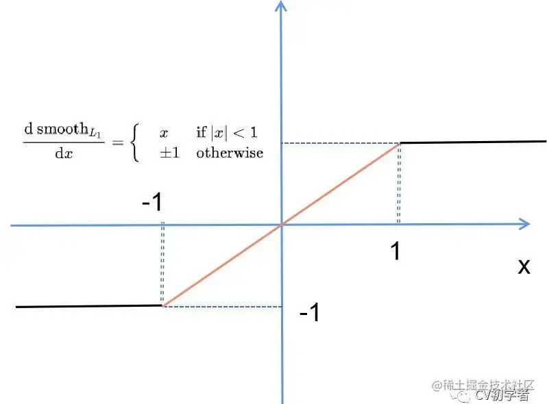 最后观察 (6), Smooth L1 Loss 在 x 较小时,也就是[-1,1] 区间,对 x 的梯度也会变小;而在 x 很大时,对 x 的梯度的绝对值达到上限 1,也不会太大以至于破坏网络参数。 完美地避开了L1 loss 和 L2 loss损失的缺陷。